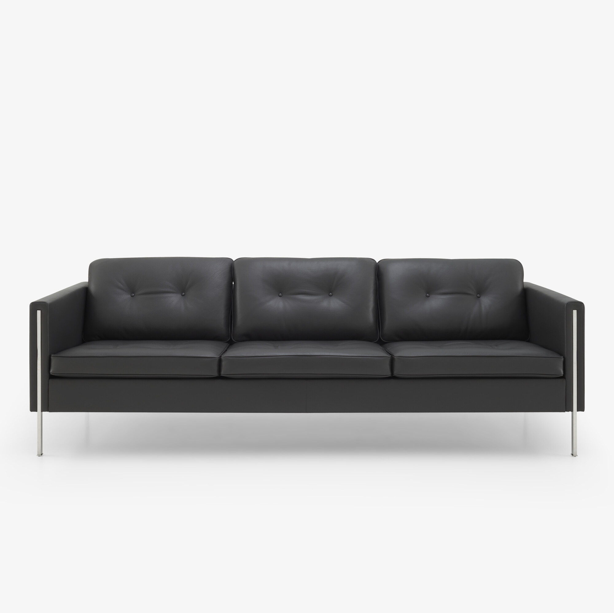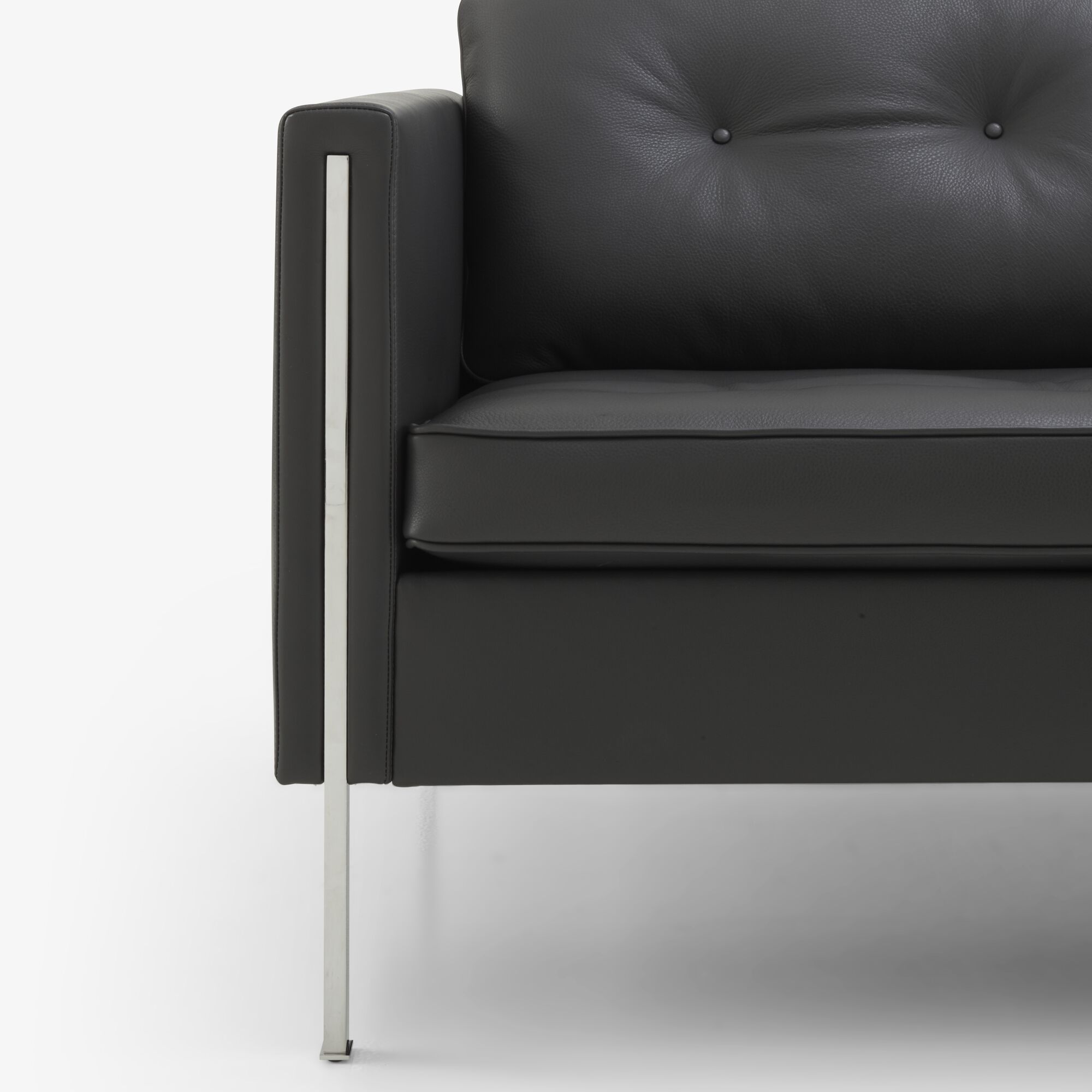 Structure: Panneaux de lamelles 3 couches croisées et panneaux multiplis renforcés par une structure d’assise mécanosoudée en acier, parementés de mousse polyéther. Piétement avec insert accoudoir apparent en acier section carrée finition chromé brillant ou chromé noir brillant.