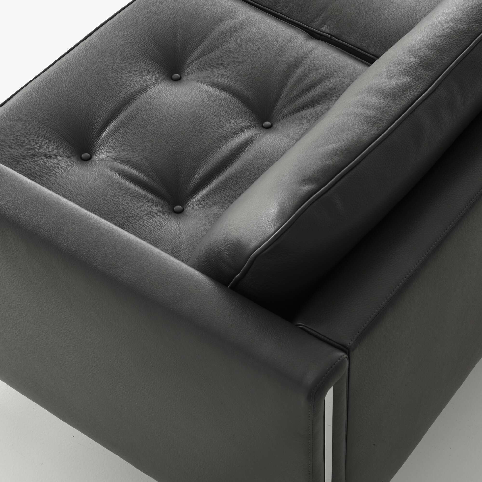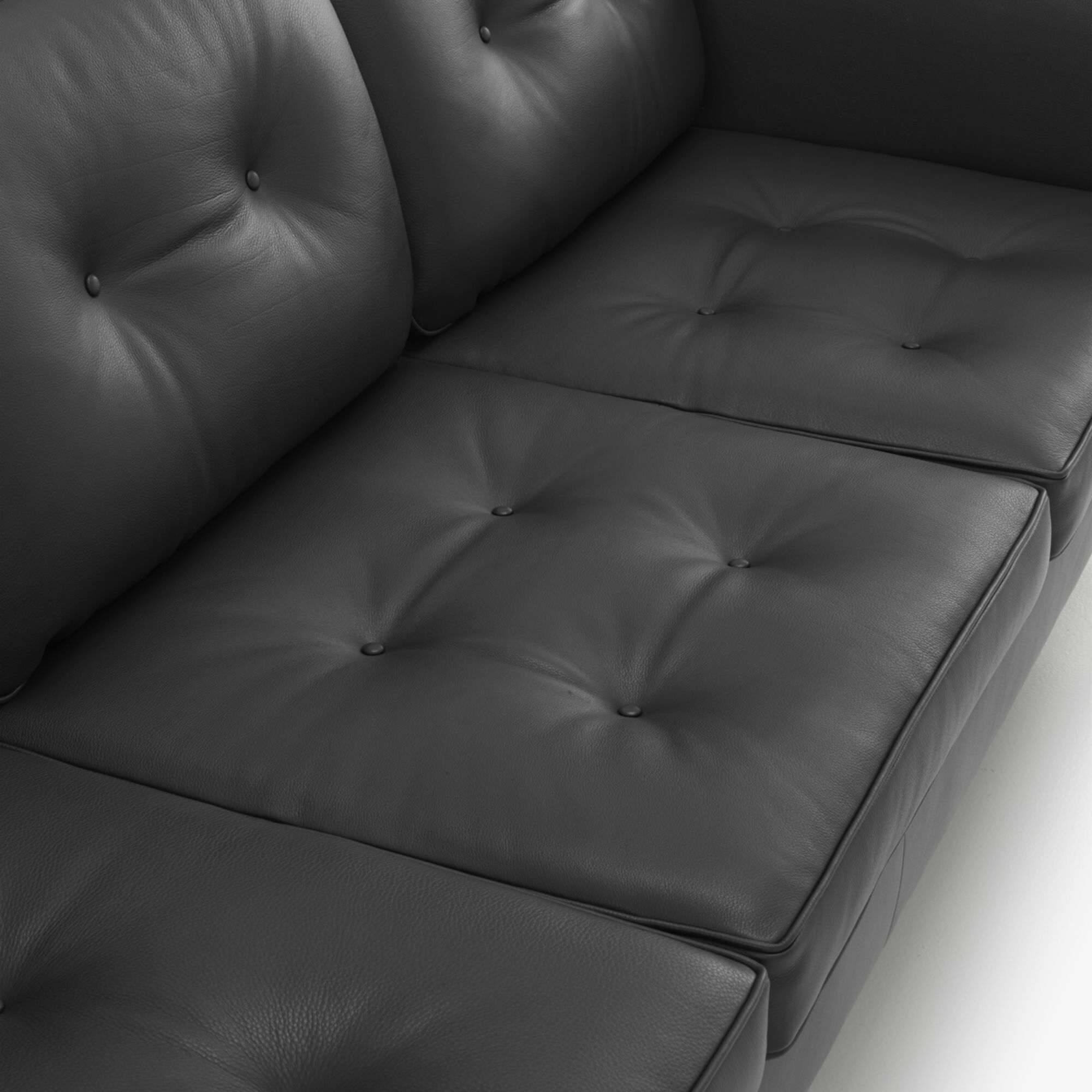 Coutures/Housses: Coutures baguettes sur la structure et accoudoirs. Coussins d’assise capitonnés par 4 boutons, coussins de dos capitonnés par 2 boutons. Dessin des coussins d’assise et dos souligné par passepoil.
