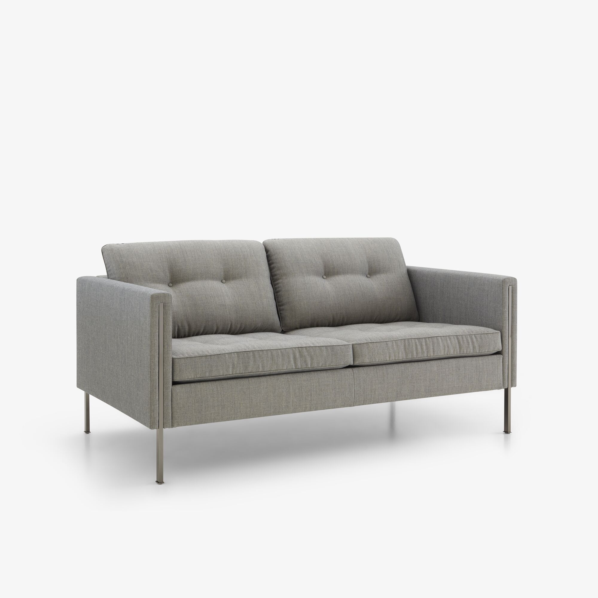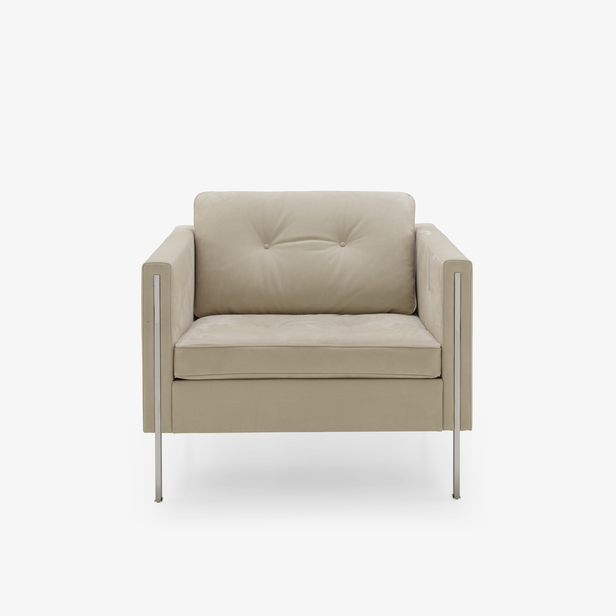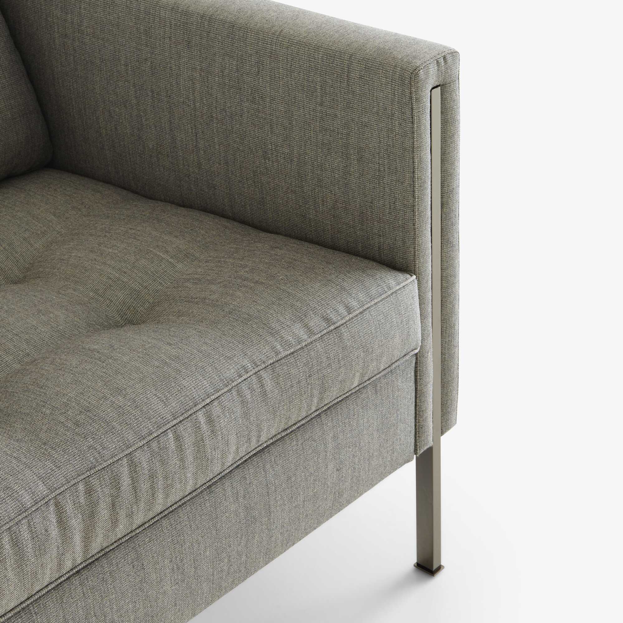 Structure: Panneaux de lamelles 3 couches croisées et panneaux multiplis renforcés par une structure d’assise mécanosoudée en acier, parementés de mousse polyéther. Piétement avec insert accoudoir apparent en acier section carrée finition chromé brillant ou chromé noir brillant.
