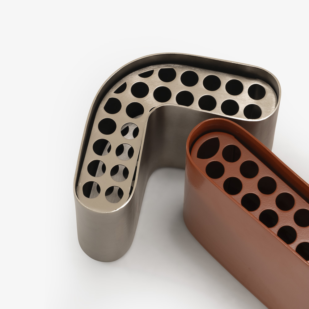 La collection de vases Architectural permet de réaliser des bouquets structurés, comme ceux de l’art floral ancestral japonais Ikebana. Les vases en acier inoxydable découpés au laser, sont équipés de pique-fleurs perforés amovibles, offrant ainsi la possibilité de réaliser de magnifiques compositions florales et des bouquets rythmés en insérant les tiges dans les perforations.