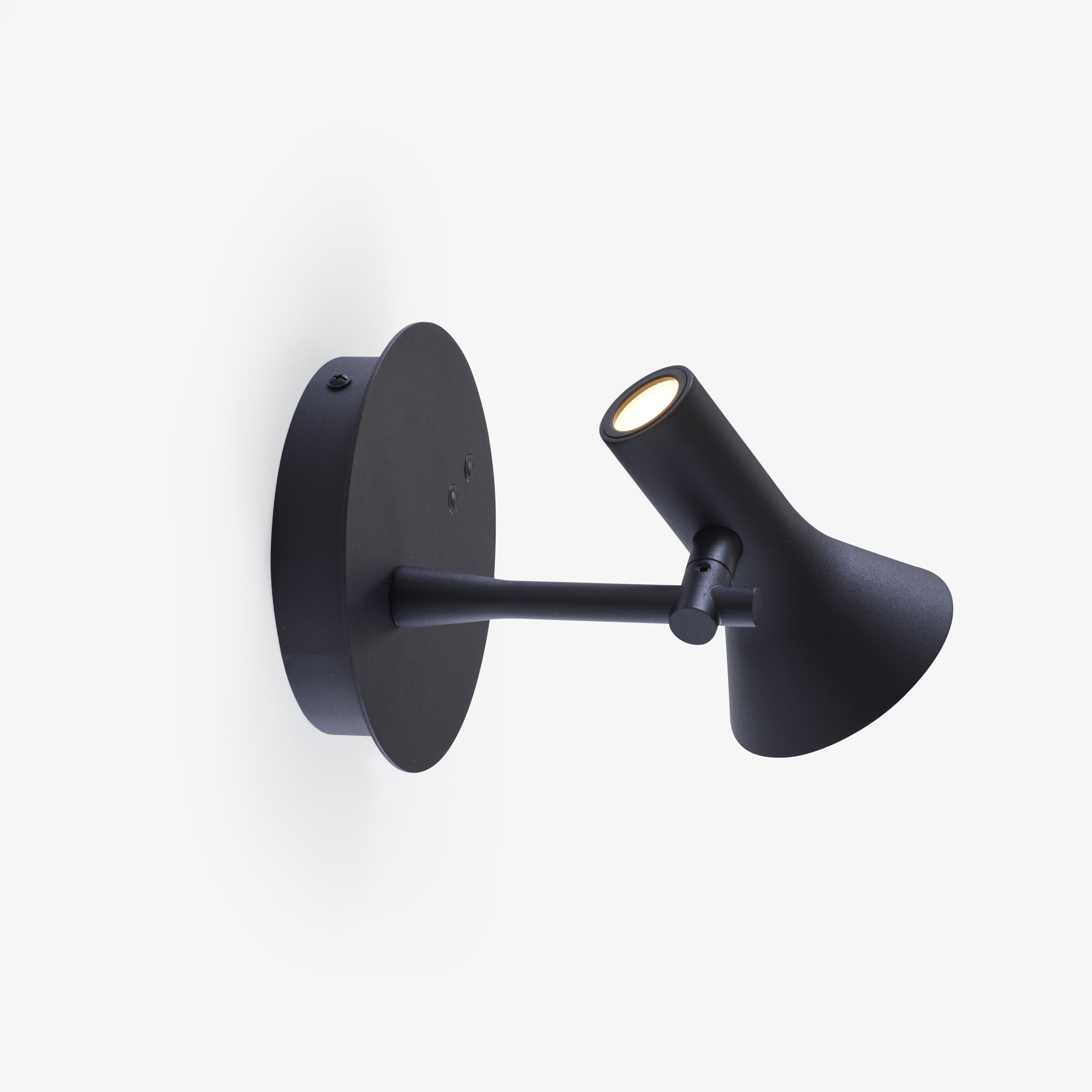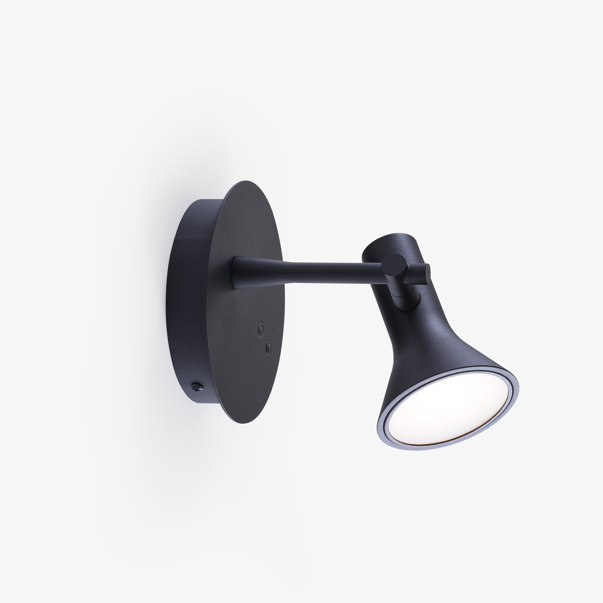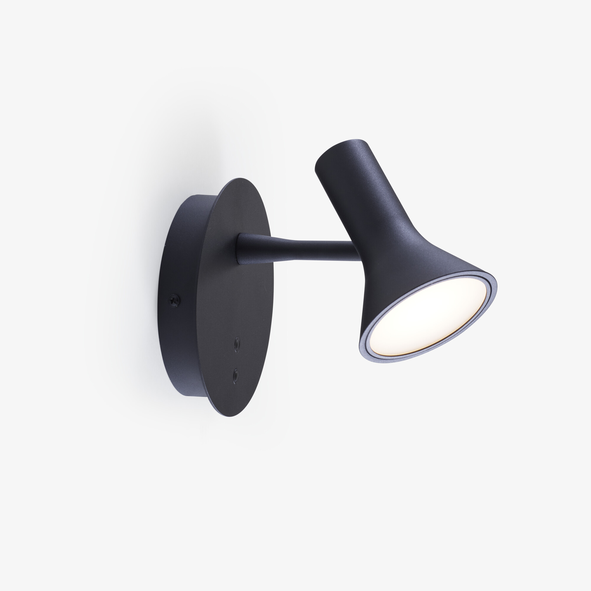 Abat-jour rotatif en aluminium repoussé passant d’une forme cylindrique à conique a son extrémité. Support mural métallique ø 150 mm, en finition laqué époxy noir satiné. Un premier module LED situé à l’extrémité cylindrique de l’abat-jour et protégé par un diffuseur en PMMA, éclaire vers le haut : puissance 3W température de couleur 3000 K (blanc chaud) 330 lumens. Un second module LED situé à l’extrémité conique de l’abat-jour et protégé par un diffuseur en PMMA, éclaire vers le bas : puissance 7W température de couleur 3000 K (blanc chaud) 770 lumens. Variation indépendante de l’intensité pour chaque module LED grâce à 2 interrupteurs/variateurs situés sur le support mural. Possibilité de brancher l’applique directement au mur ou laisser le cordon d’alimentation glisser le long du mur pour être branché dans une prise. Câble électrique PVC transparent. Interrupteur à main transparent. Alimentation LED DC 12V, Max 12W situé à l’intérieur du support mural.