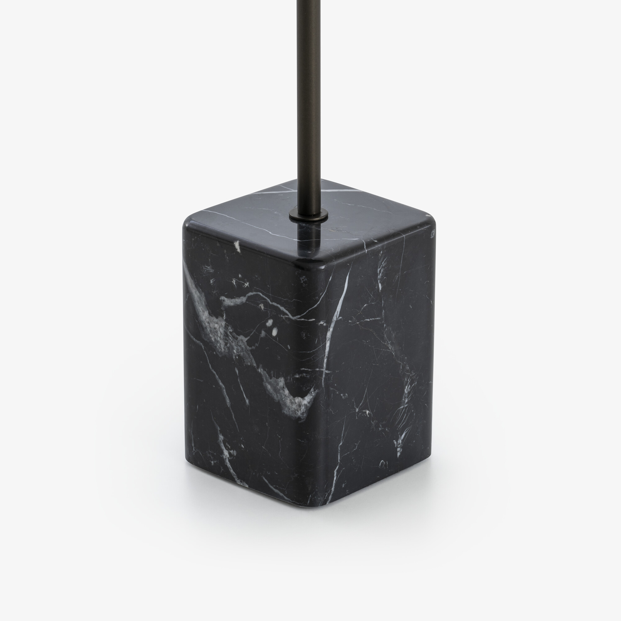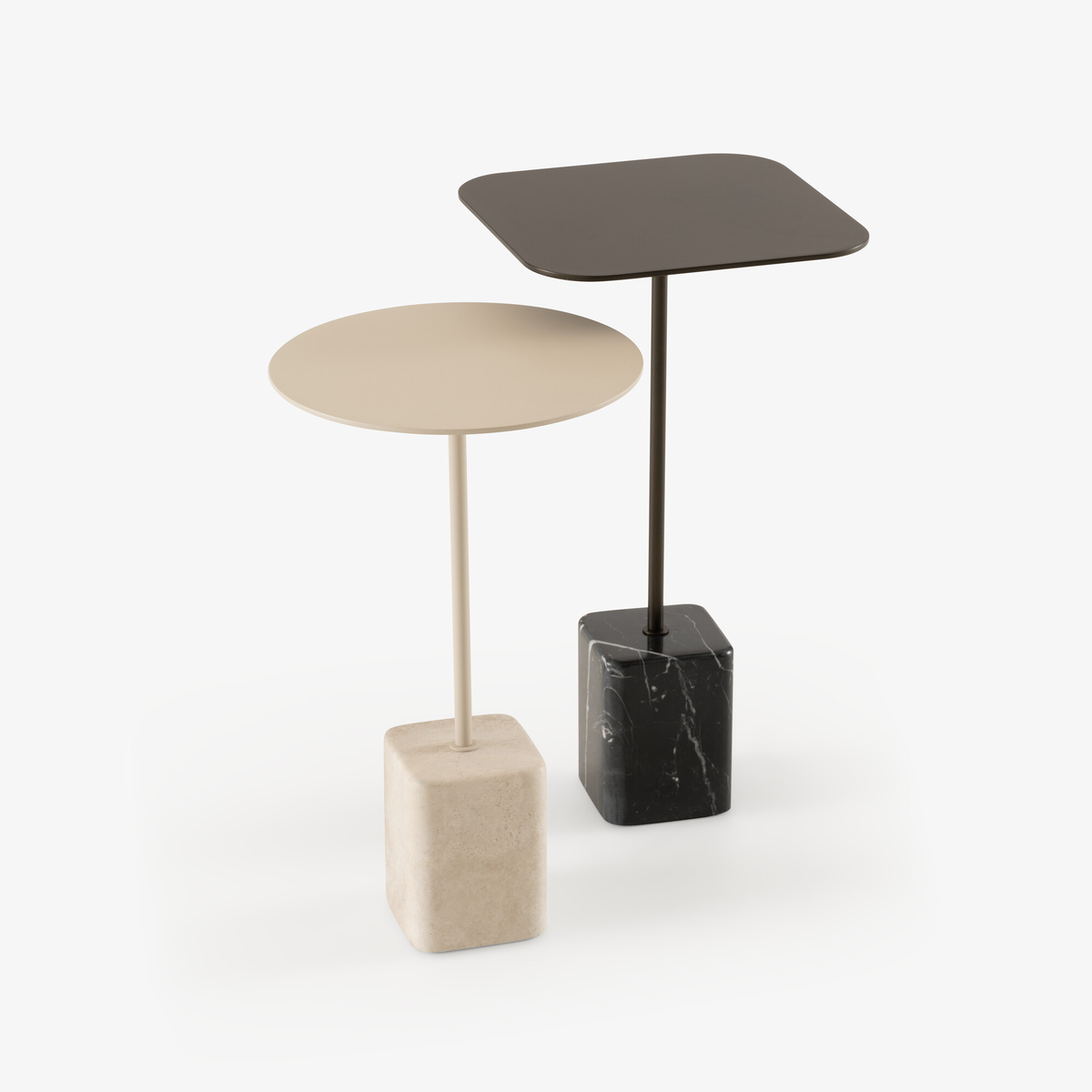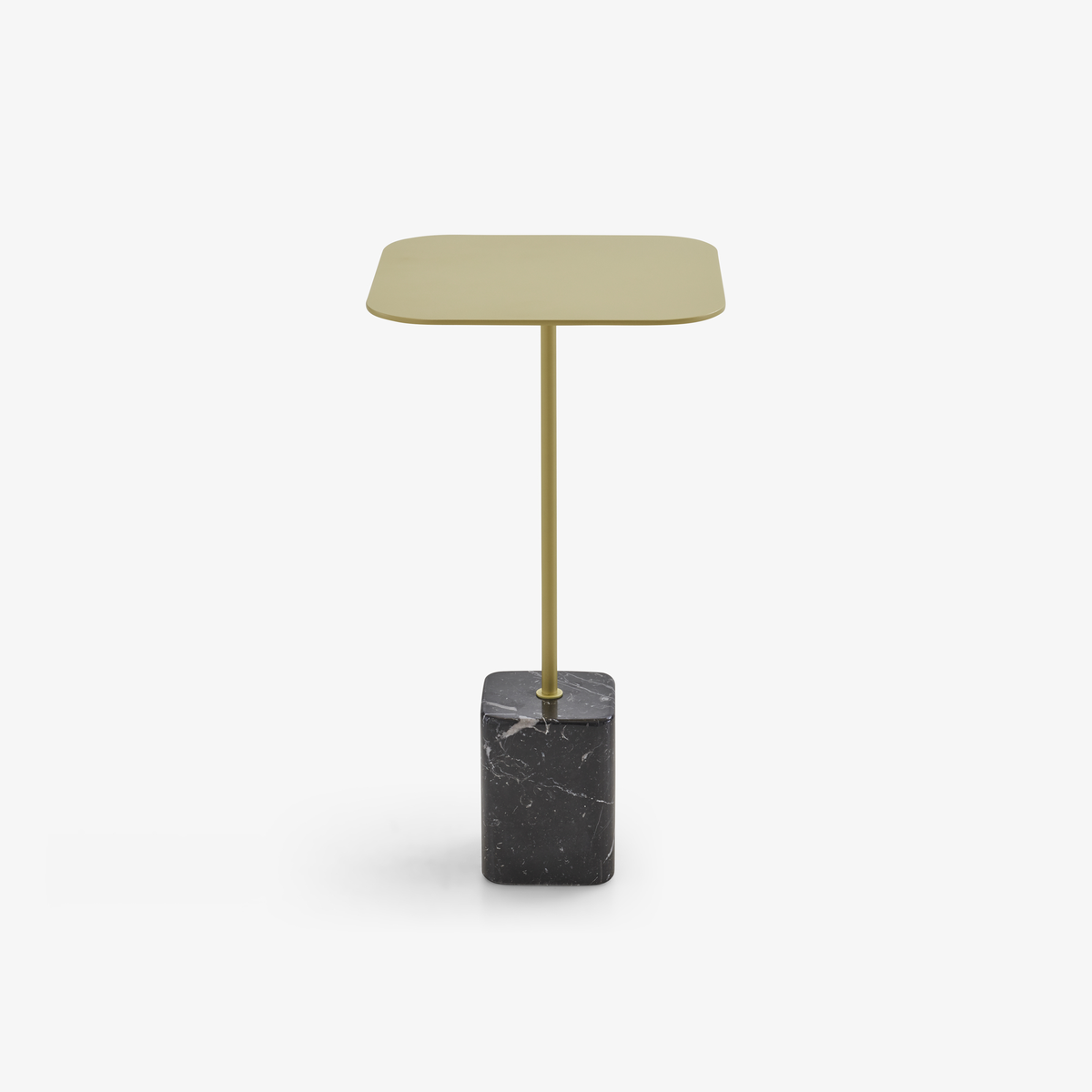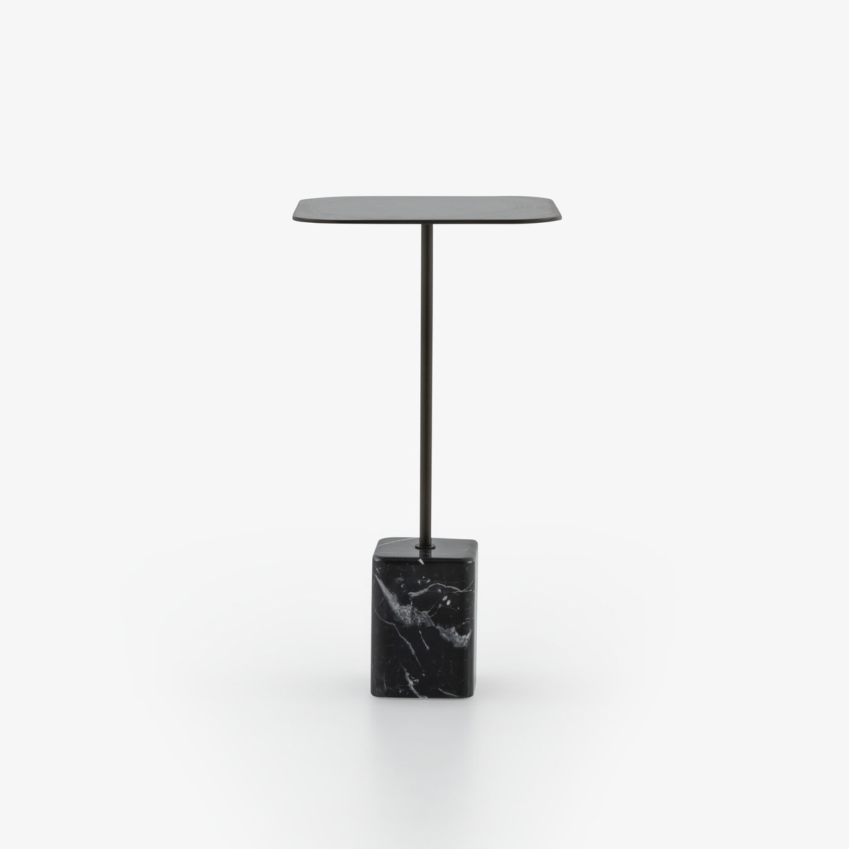 Table d’appoint composée d’un plateau et d’un mât en acier laqué coloris laiton traité antitache et d’une base en marbre noir (marquina) ou composée d’un plateau et d’un mât en acier laqué coloris dark bronze et d’une base en marbre noir (marquina) avec traitement hydrofuge.