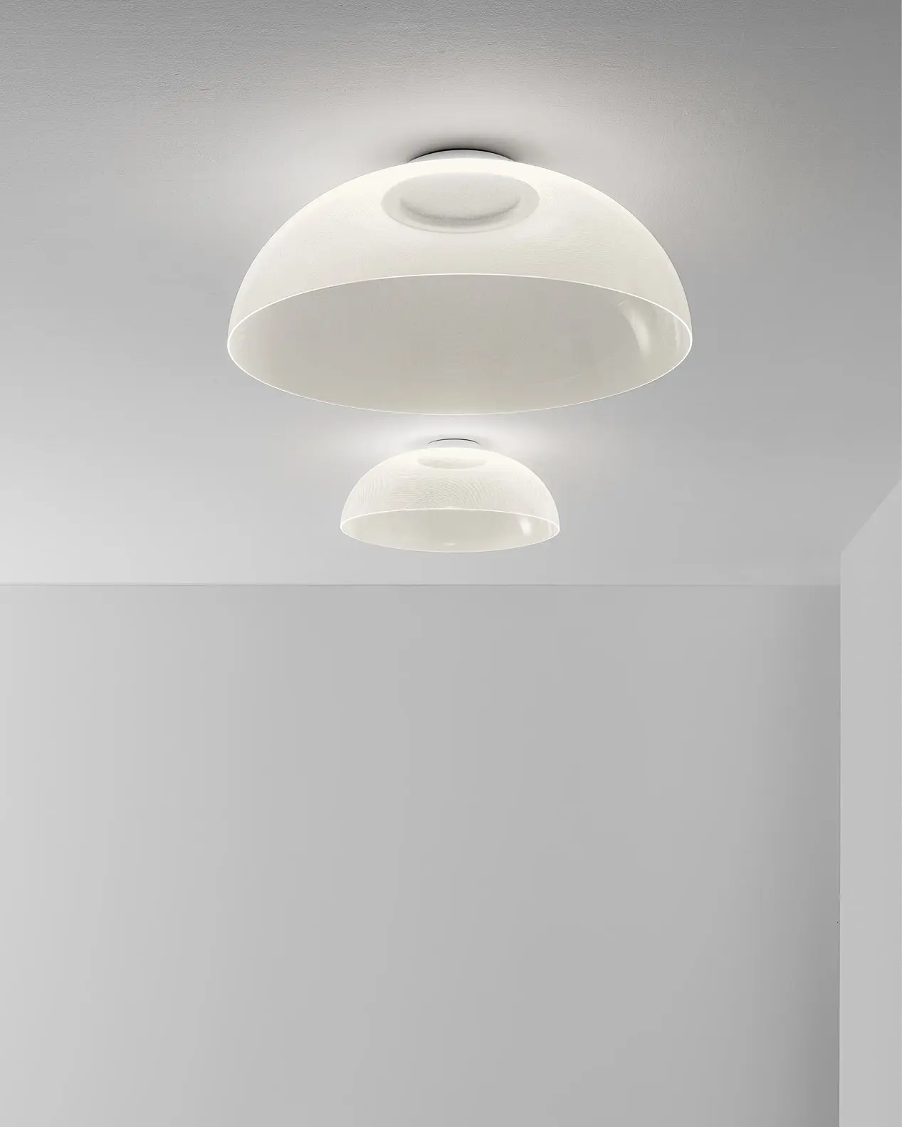 Éteinte, Demì se présente comme un majestueux dôme transparent, un parfait équilibre entre légèreté et élégance discrète. Lorsqu’elle s’allume, la magie opère : sa surface finement micro-incisée au laser capte et diffuse la lumière avec une harmonie extraordinaire, tandis que son bord inférieur émet une lueur douce et enveloppante. Le résultat est un éclairage sophistiqué et envoûtant, sublimant chaque espace d’une touche d’élégance exclusive.
