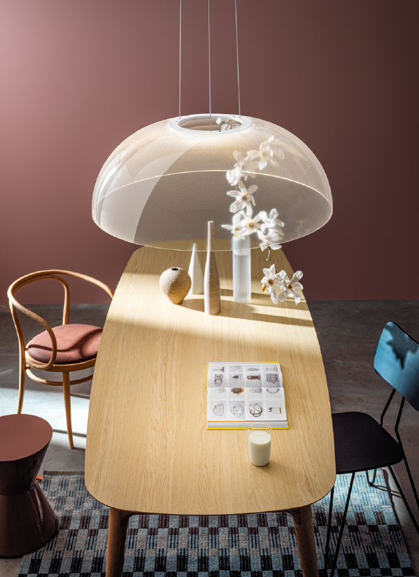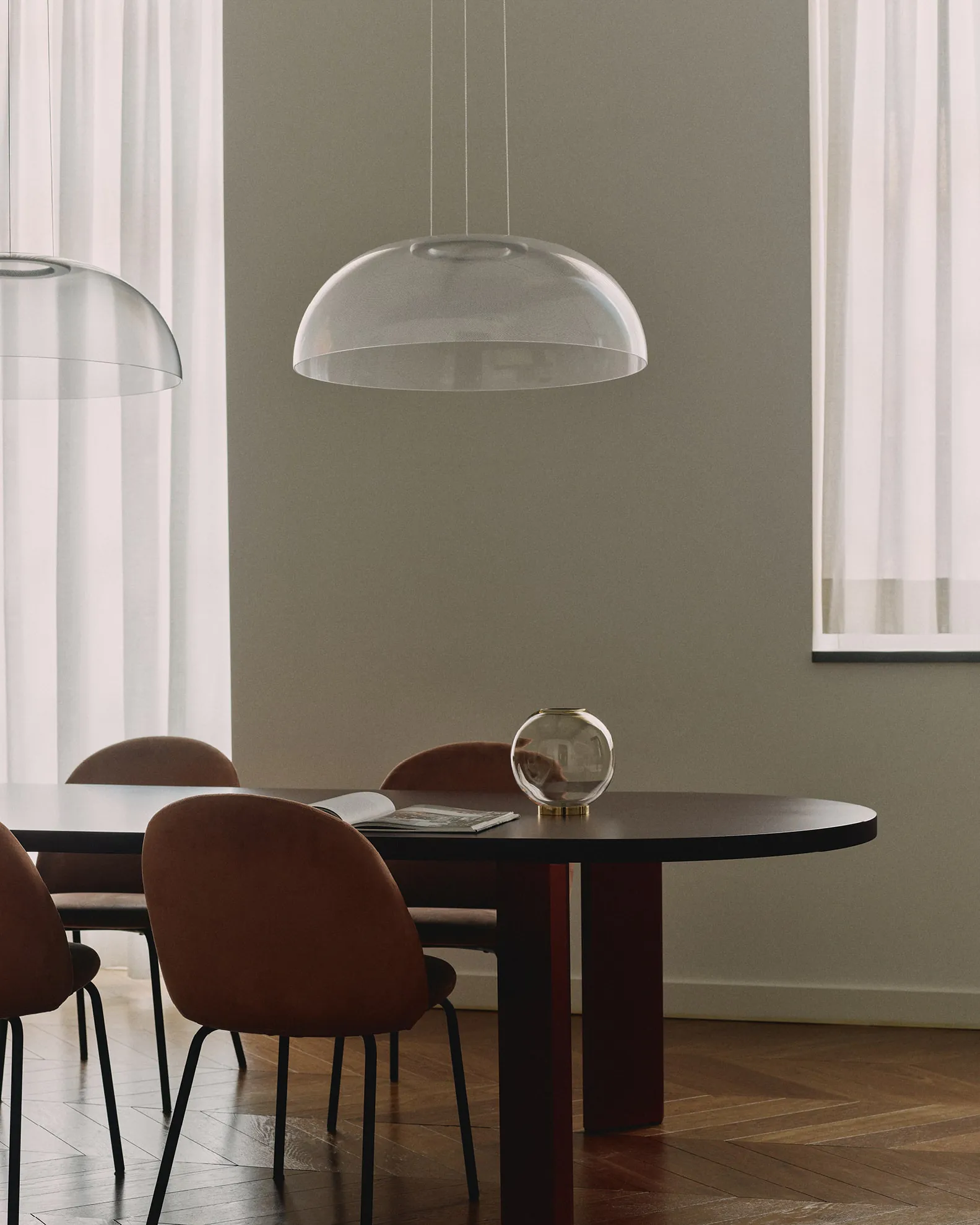 Éteinte, Demì se présente comme un large dôme transparent, une présence légère et discrète dans l’espace. Mais une fois allumée, elle révèle son caractère unique : le bord inférieur et les micro-incisions laser diffusent une lumière douce et enveloppante.