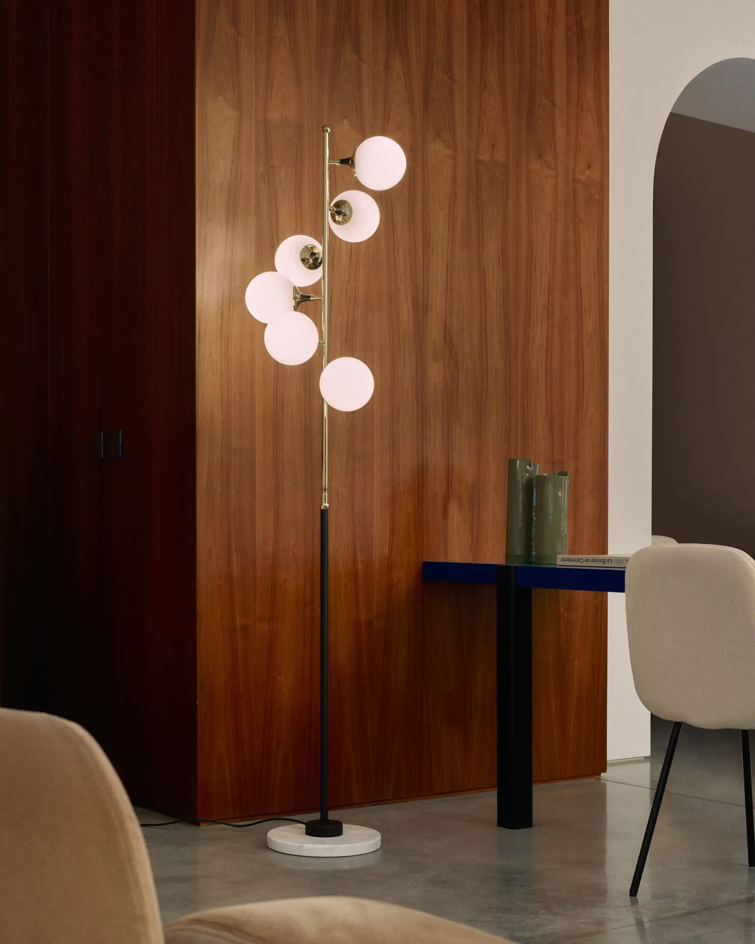 Le lampadaire Galassia transforme chaque espace en un hommage raffiné aux années cinquante, époque emblématique d’élégance et d’avant-garde. Ses six sources lumineuses, enveloppées dans un précieux verre triplex blanc soufflé, s’entrelacent dans un mouvement fluide et harmonieux, évoquant le charme des galaxies lointaines et la magie du cosmos. Des lignes élancées et des détails soignés dessinent une silhouette sculpturale, capable de dialoguer avec les espaces les plus exclusifs, des salons bourgeois aux architectures contemporaines.