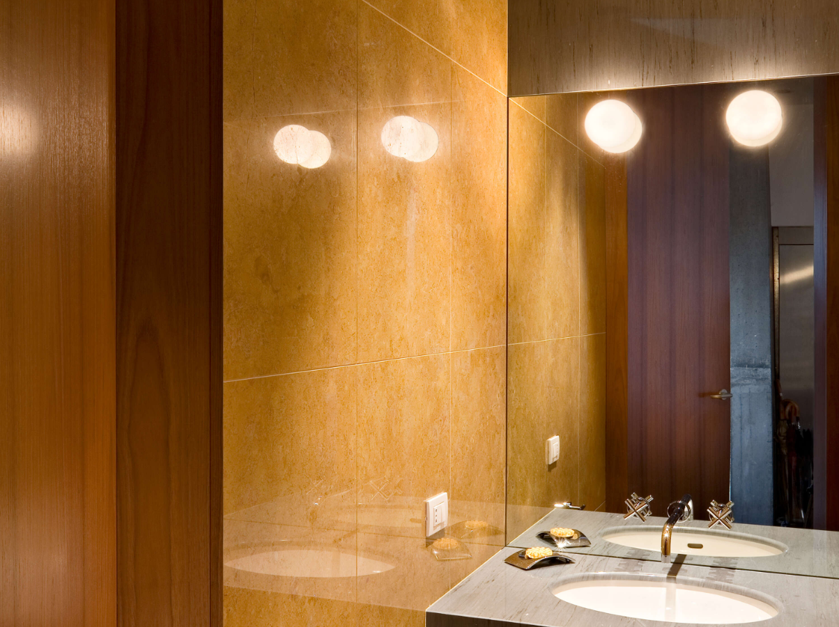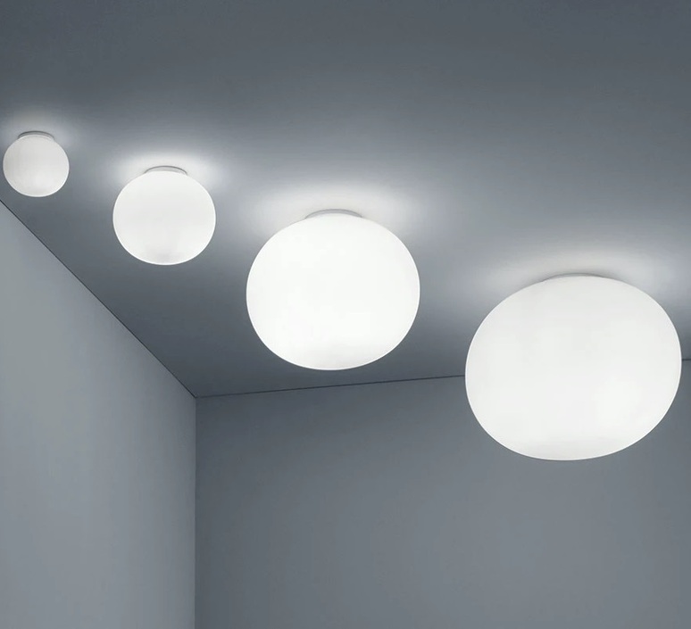 Lampe pour applique/plafonnier à lumière diffuse. Diffuseur en verre opalin gainé, soufflé à la bouche et acidifié. Attache filetée en PPS coloris blanc moulé par injection (UL-94 V0).