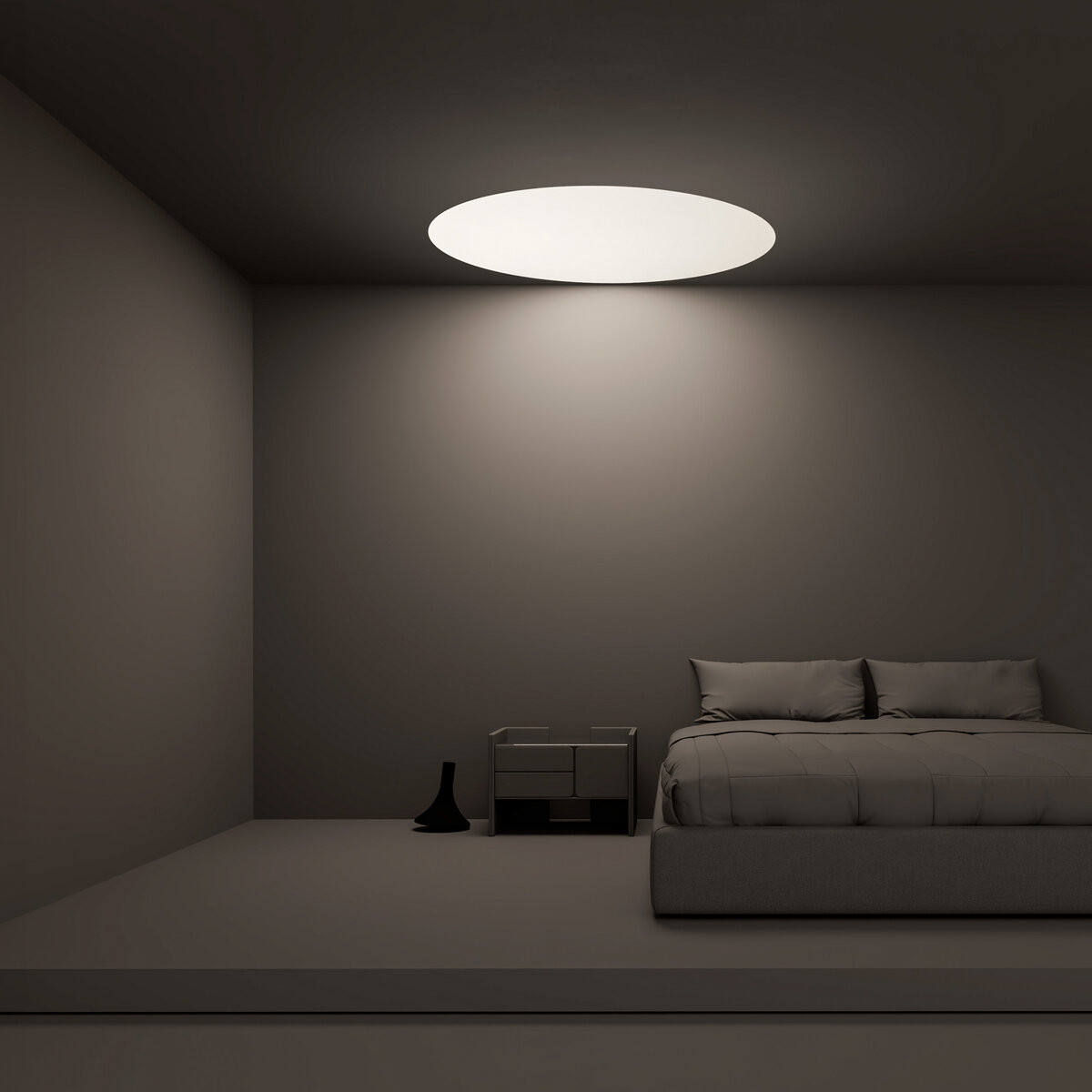 Le point de départ ? Un signe lumineux qui apparaît et définit l’espace. Une lampe mobile, de table ou de sol, capable d’évoquer la suspension entre lumière et ombre. Un système optique spécial définit parfaitement un cercle de lumière sur le plafond et crée un effet précis, presque métaphysique. Une frontière nette entre la clarté et l’obscurité, une présence immatérielle qui se manifeste avec élégance. La lumière peut se transformer, devenir couleur, suggérer des atmosphères inédites. Un geste essentiel pour donner forme à de nouvelles perceptions et dessiner l’espace avec la légèreté de l’intuition.