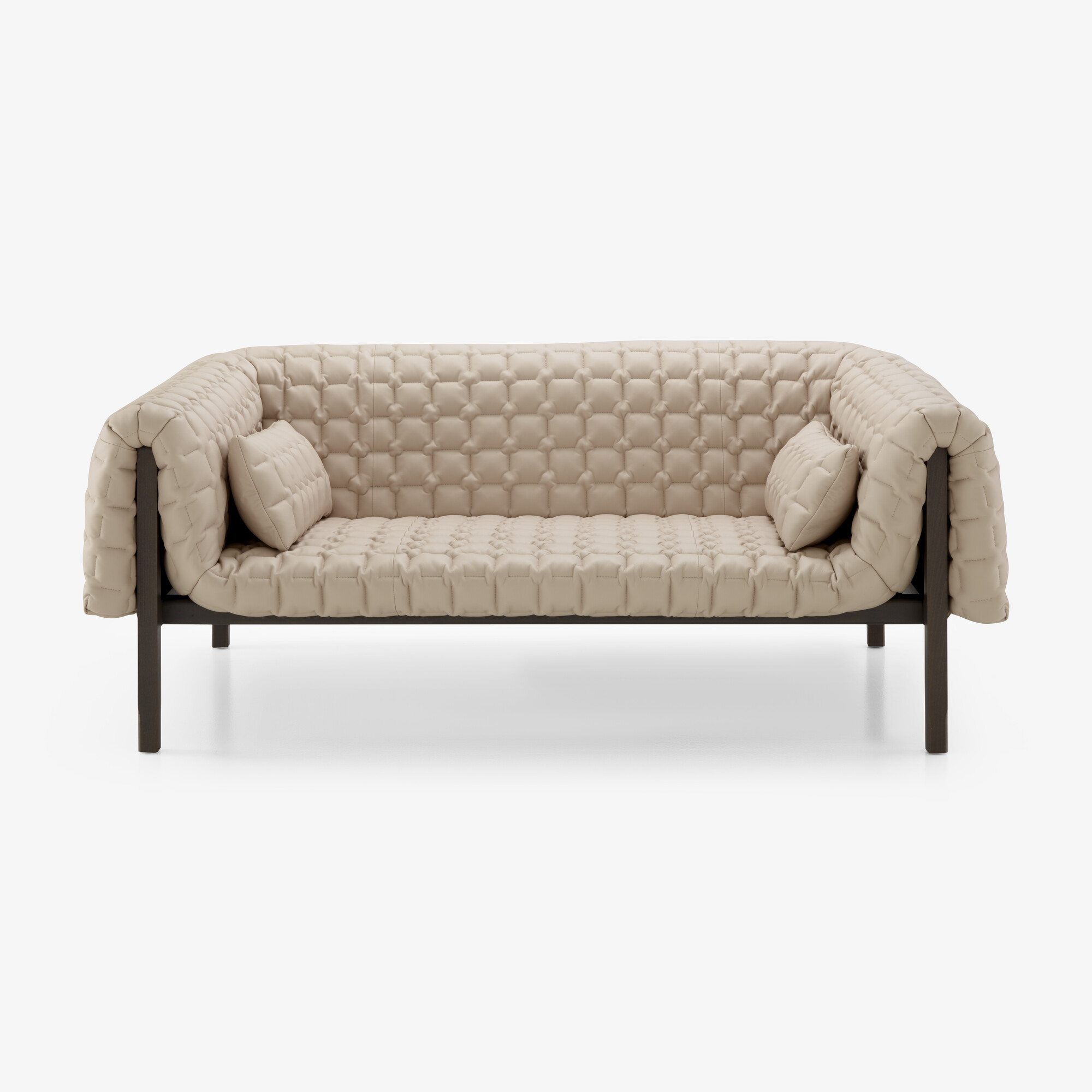 Ruché (étoffe froncée ou plissée qui sert d’ornement sur un vêtement) associe pour Ligne Roset l’inhabituel et la tradition. L’inhabituel avec cette structure en bois massif, et la grande tradition : le matelassage, coeur de son savoir-faire. Élancé et fin, Ruché est néanmoins accueillant et moelleux. La conception même de Ruché permet une déclinaison de sièges qui allient confort et logeabilité, idéales pour de petits appartements. Enfin, sa hauteur d’assise séduira toutes les clientèles, y compris celle que rebutent des assises trop basses. Les 2 canapés se déclinent également en version bas dossier (65 cm au lieu de 83 cm) avec une assise plus basse (38 cm au lieu de 46 cm), une profondeur plus importante (101 cm au lieu de 92 cm) et un renvers assise/dossier avec cale-reins intégrés. Ils présentent alors le double avantage d’un confort remarquable et d’un look de vrai canapé d’intérieur qui l’éloigne de l’aspect banquette. Sa ligne surbaissée permet de l’intégrer avec élégance à tous les espaces même les plus petits.